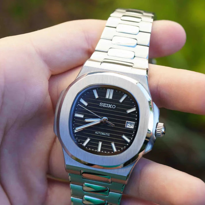 Voici la Mod Nautilus, un garde-temps étonnant qui allie style et durabilité pour créer une montre exceptionnelle. Modifiée sur mesure avec une attention immaculée aux détails, cette montre se distingue de ses pairs par son cadran saisissant enfermé dans un boîtier robuste en acier inoxydable. Animée par le célèbre mouvement NH35, vous pouvez faire confiance à sa précision et à sa fiabilité pour les années à venir. Le design Nautilus est parfaitement exécuté sur les lignes épurées de ce modèle, lui conférant à la fois élégance et polyvalence - que ce soit pour le travail ou les loisirs - tout en mettant en valeur votre goût incroyable pour l'artisanat horloger. Possédez un trésor intemporel dès maintenant !